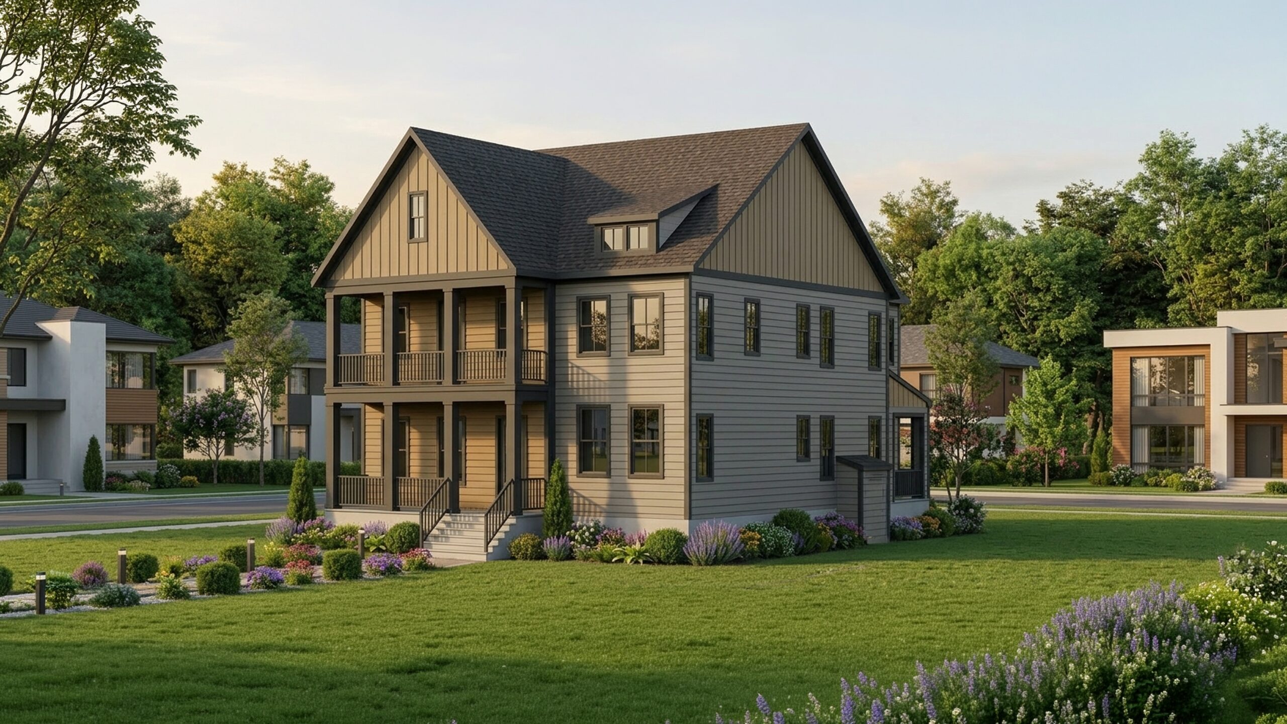 The Mt. Prospect Travilah in Arizona, USA, is a Refined Modern Craftsman Residence that Emphasizes Verticality and Clean Lines. Its Facade Features a Striking Tri-Partite Design, Blending Vertical Board-and-Batten with Horizontal Lap Siding in Earthy, High-Desert Tones. The Architectural Focal Point is the Double-Decker Integrated Porch, Which Utilizes Dark-Trimmed Columns to Create Depth and Curb Appeal. By Tucking the Two-Car Garage into the Rear, the Home Maintains a Pedestrian-Friendly Front Elevation, Prioritizing Symmetrical Window Banks and a Manicured Entryway over Driveway Pavement.